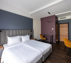 Мы заботимся о вашем комфорте, поэтому двуспальная кровать оснащена удобным ортопедическим матрацем, во всех номерах есть кондиционеры и теплый пол в ванной комнате.