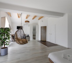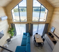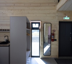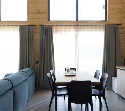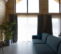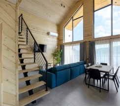 Просторный Барнхаус, залитый естественным светом, приглашает вас погрузиться в атмосферу уюта и гармонии с природой. Деревянная отделка стен и потолков создает тёплую, располагающую обстановку, а большие панорамные окна позволяют любоваться прекрасными видами прямо из зала. Простая и стильная мебель подчёркивает современный дизайн, создавая идеальное место для отдыха и вдохновения большой семьи или нескольких дружных компаний.