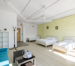 В номере: односпальные кровати, стол и табуреты, тумбы прикроватные, холодильник, ТВ.