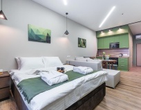 Прекрасный дизайнерский номер. У меня был Gray Есть халаты, тапочки, зубные щетки. Даже посудомоечная и стиральные машины. Подхолит для длительного проживания. В районе Сколково