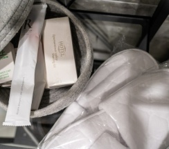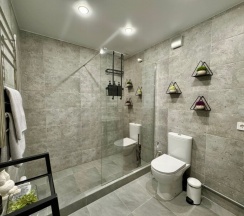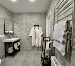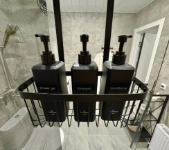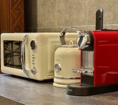 Здесь есть все для комфортного проживания: тапочки, халаты, зубной и бритвенные наборы; шампунь, кондиционер для волос и гель для душа. Мини кухня оборудована микроволновкой, чайником, капсульной кофе машиной и необходимой посудой.