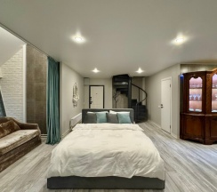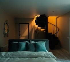 Трехуровневые апартаменты площадью 115 м2. На первом - спальня, гостиная, кухонная и обеденная зоны; кинозал на втором и небольшая зона чилаут на третьем с видом на лес.