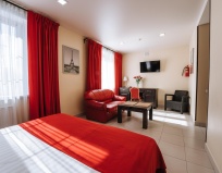 В номере люкс места много, есть где развернуться. Кожаный диван удобный. Рад, что выбрал улучшенный вариант. Тихое место, выспался отлично.
