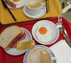 Очень не плохие завтраки. Чай, кофе зерновой, морсы, компот, тосты или хлеб, колбаса и сыр, масло, на выбор 2 горячих блюда: блинчики, яичница, сосиски, каши . Очаровательная и терпеливая хозяйка кухни Анна. Всегда внимательная и приветливая. Спасибо ей и ее помощнице.