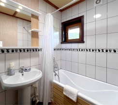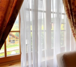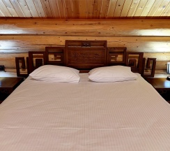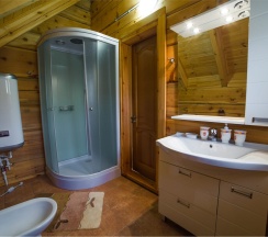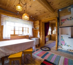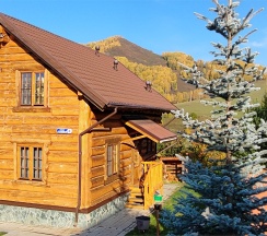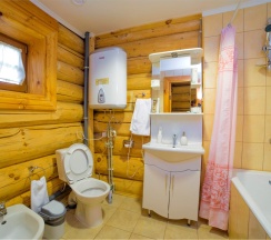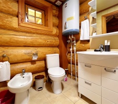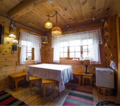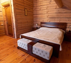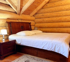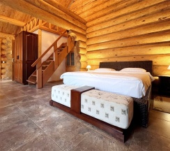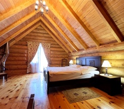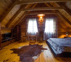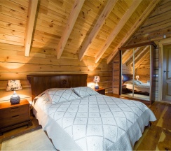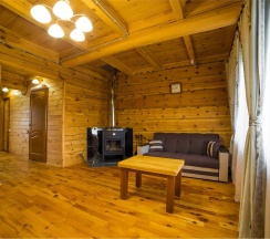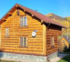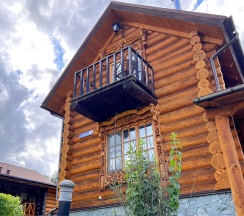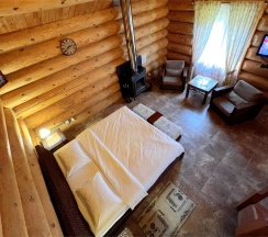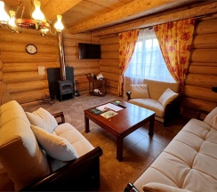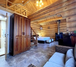 Двухэтажный коттедж из хвойных пород дерева. На первом этаже гостиная с большим камином и мягкой зоной отдыха. На втором этаже уютная спальня с двуспальной кроватью, балкон с видом на горы.