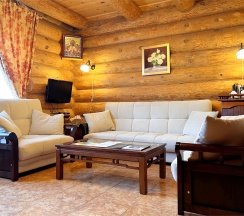 Домики такие барские, как в русских сказках, рисунок на бревнах сказочный в комнатах, тепло камина..