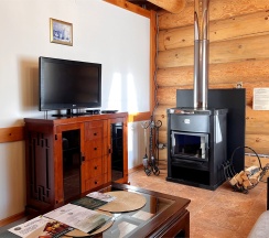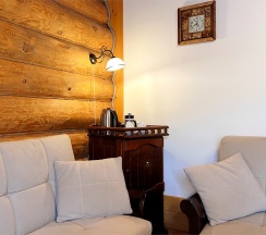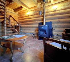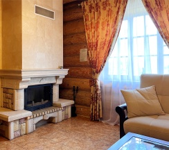 Каждая половина дома разделена на гостиную-спальню с мягкой зоной отдыха и камином. Имеется дополнительное спальное место на полатях под крышей.