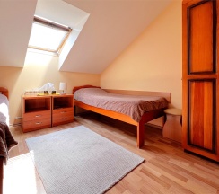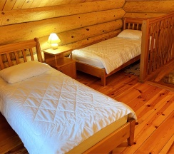 В каждой половине дома, на первом этаже: гостиная с камином и мягкой зоной отдыха. На втором этаже проходная комната с двумя односпальными кроватями, и отдельная комната с двуспальной кроватью.