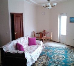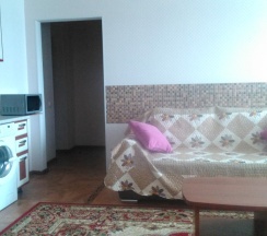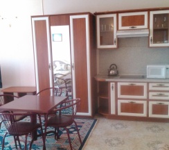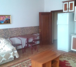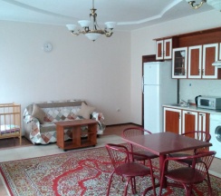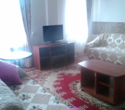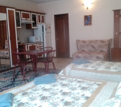 Номер находится на первом этаже. В номере имеется: двуспальная кровать, диван-кровать, миникухня, варочная панель. холодильник, микроволновка, эл.чайник, кухонные принадлежности, ТВ (триколор), Wi-Fi