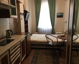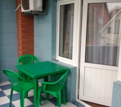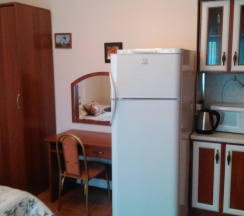 Расположен на первом этаже. В номере имеется минихолодильник, микроволновка, эл.чайник, варочная панель, кухонные принадлежности, ТВ (триколор), Wi-Fi,