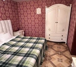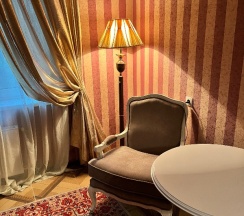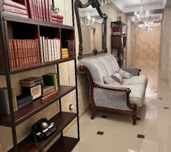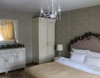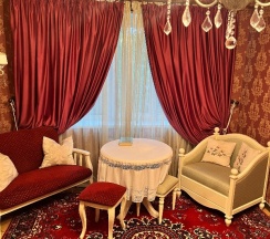 Интерьер, по дворянски, но подобранный так, что приятно глазу, ковры, гобелены, мебель, кружева на скатертях и подушках.
