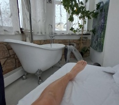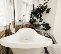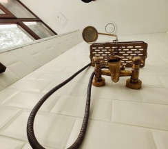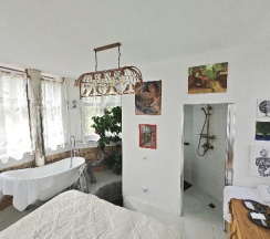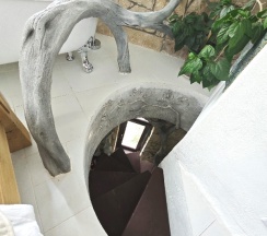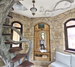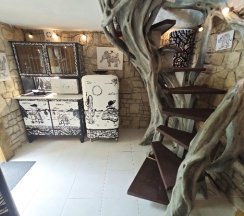 На первом этаже зона кухни и прихожая, на втором зона отдыха с диванчиками и камином и третий этаж это спальня с ванной прямо в комнате и отгороженная душевая с туалетом биде. Каждый этаж выполнен в своем стиле, очень много картин и стилизованных предметов, наверху цветет и благоухает живой гибискус.