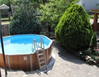В саду есть бассейн, шезлонги, беседки с мангалами. Хозяин великодушно поделился углями и розжигом.