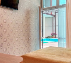 Хороший гостиничный дом с удобным расположением. В номере чисто, ТВ, чайник, холодильник, душевая - все в наличии. Кухня общая. Территория небольшая, но есть бассейн с подогревом и лежаками.