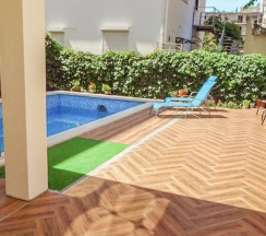 3. Бассейн с лёгким подогревом, 1,6 м глубина везде. Не умею плавать хорошо,поэтому мне было некомфортно. У бассейна хорошие лежаки. Оборудованы отличный душ и туалет. Зелёной территории нет вообще.