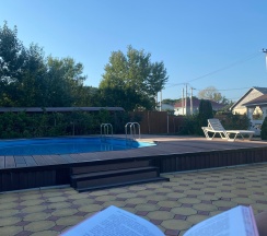 ОТличный гостевой дом. Чисто,уютно,большие номера,бассейн большой,чистый. Территория с беседками,мангалами,есть виноградная аллейка,где можно посидеть,отдохнуть,покушать. Столовая на территории,очень вкусно готовят. Все отлично,всем рекомендую.