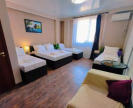 Просторный светлый номер с возможностью размещения до 5 человек с видом на бассейн и внутренний дворик отеля. В номере располагаются: Большая двуспальная и три отдельные односпальные кровати, прикроватные тумбочки, шкаф, мини-холодильник, кондиционер, телевизор и сушка для одежды.