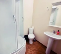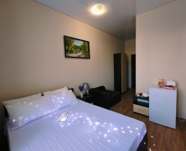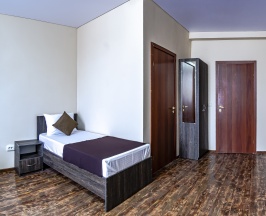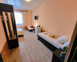 Уютный трехместный однокомнатный номер с большой двуспальной и односпальной кроватями, и прикроватными тумбочками. В номере расположены: кондиционер, шкаф, мини-холодильник, телевизор, сушилка для белья. Вид из окна на соседний корпус.