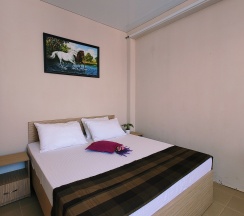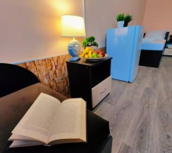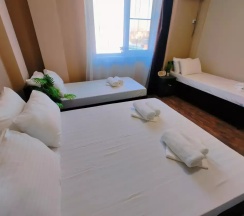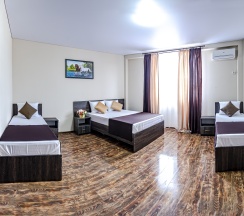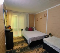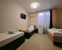 Просторный светлый однокомнатный номер на 4 человека. С большой двуспальной и двумя односпальными кроватями, и прикроватными тумбочками. В номере расположены: кондиционер, шкаф, мини-холодильник, телевизор, сушка для белья. Вид из окна на улицу