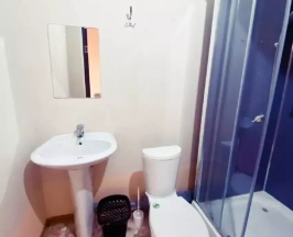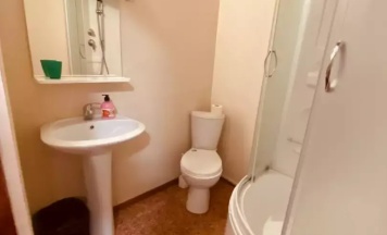 В ванной комнате с душевой кабинкой расположены полотенца и одноразовые косметические средства.