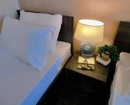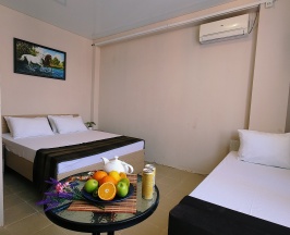 Светлый уютный четырехместный номер с видом на бассейн и внутренний дворик отеля. В номере располагаются: Большая двуспальная и двумя односпальными кровати, прикроватные тумбочки, шкаф, мини-холодильник, кондиционер, телевизор и сушка для одежды.