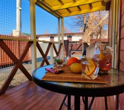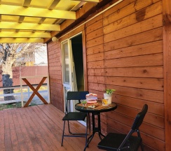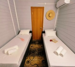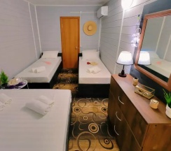 Небольшой трехместный номер с индивидуальным входом, деревянной отделкой и собственной зоной отдыха с летней мебелью. В номере располагаются: Большая двуспальная и односпальная кровати, прикроватные тумбочки, телевизор, кондиционер, мини-холодильник, зеркало и вешалка.