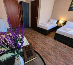 Светлый уютный трехместный однокомнатный номер с двуспальной и односпальной кроватями, и прикроватными тумбочками. В номере расположены: кондиционер, шкаф, мини-холодильник, телевизор, сушилка для белья. Вид из окна на улицу