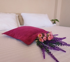 Светлый уютный трехместный номер с видом на бассейн и внутренний дворик отеля. В номере располагаются: Большая двуспальная и односпальная кровати, прикроватные тумбочки, шкаф, мини-холодильник, кондиционер, телевизор и сушка для одежды.