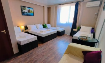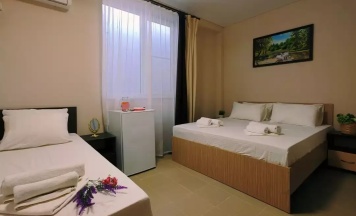 Номер оснащен: большая двуспальная кровать, две односпальные кровати, прикроватные тумбочки, ТВ, кондиционер. мини-холодильник, вешалка зеркало
