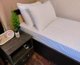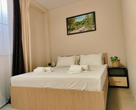 Светлый уютный двухместный номер с двуспальной или двумя раздельными односпальными кроватями, и прикроватными тумбочками. В номере расположены: кондиционер, шкаф, мини-холодильник, сушилка для белья. Вид из окна на улицу