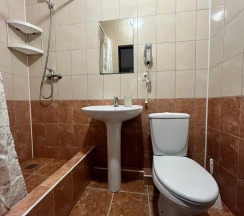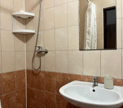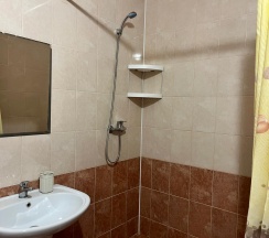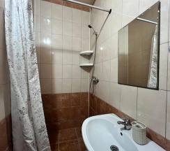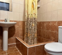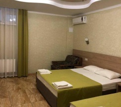 Пятиместная комната на цокольном этаже с одной двуспальной, одной односпальной кроватью и двухместным раскладным диваном. В комнате: санузел, кондиционер, телевизор, холодильник, чайник, шкаф, тумбочки. Гостям предоставляются полотенца и туалетные принадлежности.