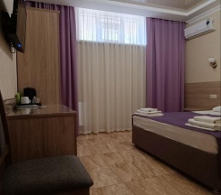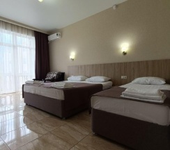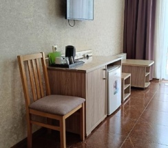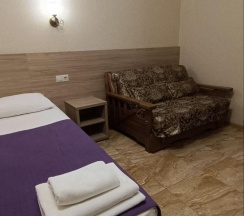 Четырехместная комната комфорт с одной двуспальной, одной односпальной кроватями и креслом-кроватью. В комнате: санузел, кондиционер, телевизор, холодильник, чайник, шкаф, тумбочки. Гостям предоставляются полотенца и туалетные принадлежности.