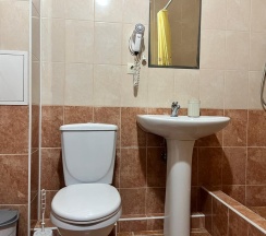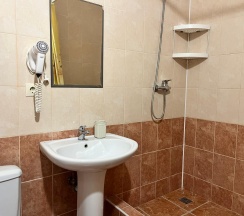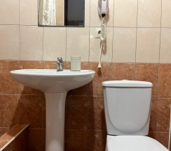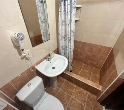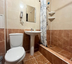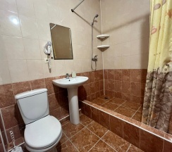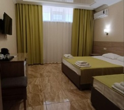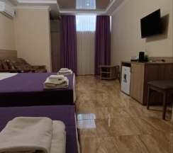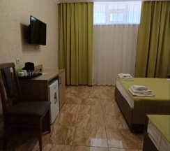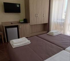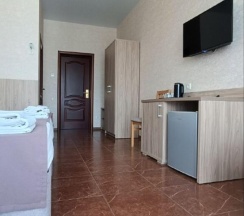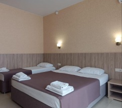 Трехместная комната стандарт с одной двуспальной и одной односпальной кроватями. В комнате: санузел, кондиционер, телевизор, холодильник, чайник, шкаф, тумбочки. Гостям предоставляются полотенца и туалетные принадлежности.