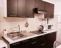 При заселении оставили залог за ключ в размере 500 рублей и сразу оплатили за всё время проживания. Администратор- приятный мужчина нам всё рассказал и показал. В отеле один туалет,одна душевая и один общий сенузел( душ и туалет). Кухонька действительно небольшая,но чистая и уютная. Есть стиральная машина.
