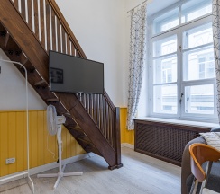 Не понравилось: Лестница на 2й уровень очень скрипит, ночью всех разбудишь. Номер дали с видом во двор, хотя при бронировании просили на город! Телевизор был сломан, но после некоторых пререканий заменили, но надо было настраивать через интернет, что занимает много времени. Дверь в ванную не закрывалась, и полотенцами в ванной страшно пользоваться. Диван на кухне не удобный, чувствуются доски. Нет фена и микроволновки.