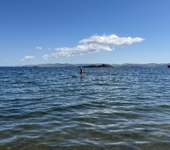 Берите с собой сап. Утром по ровной глади в прозрачной воде я увидела подводный мир. В метрах 100 от берега под водой были видны огромные сады растительности, и я говорю не про водоросли, большие кусты с раскидистыми листьями. Жаль, что не было маски для снорклинга, температура воды позволила бы рассмотреть их вблизи. На сапе было удобно доплыть до мыса «Собака» и посмотреть на оранжевые лишайники.