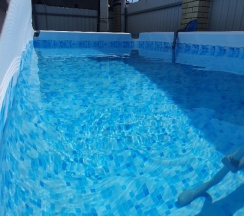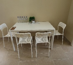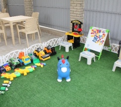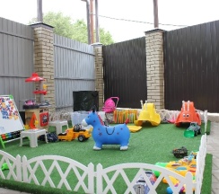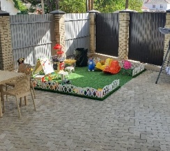 Рядом с домом имеется крытый дворик с качелей, несколькими столиками и детским уголком. Также во дворе имеется небольшой бассейн и несколько шезлонгов.