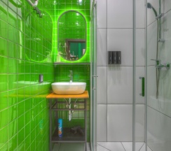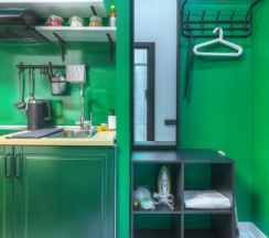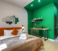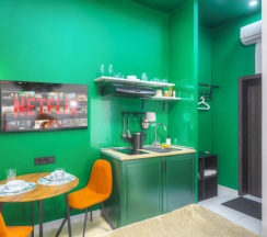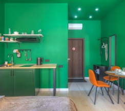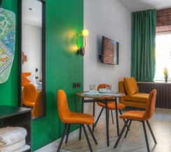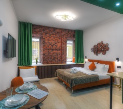 Современная студия площадью 20 кв.м. с видом на тихий дворик. До заезда можно подготовить на выбор 1 двуспальную кровать или 2 односпальные. Также в номере есть раскладной одноместный диван. Размещение рассчитано для 1-3 человек.
