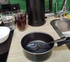 4. В номере: тапки, набор для чистки зубов, мыло, шампунь, гель для душа, кондиционер. (Ничем не пользовался, но приятно, что есть) Свой бойлер горячей воды. Хороший напор. Кондиционер. Мини холодильник, микроволновака. Индукционная плита, столовые приборы, стаканы, тарелки, чай, кофе, сахар, сливки. Очиститель воды. Электрочайник.