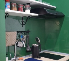 Отдыхали в Новогодние каникулы в современном номере для троих гостей. Очень уютно, чисто, есть все необходимое. Кухня : плита , чайник, холодильник, посуда. В ванной есть фен, средства гигиены, тапочки. Зеркало есть и в ванной, и в комнате. Благодарим и Рекомендуем.