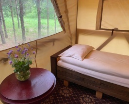 В тихой лесной зоне располагаются уютные гостевые домики. Здесь можно с комфортом отдохнуть от городского шума и суеты под пение птиц, шелест листвы и мерное покачивание гамака. Для комфорта гостей возможно, в зависимости от категории, размещение от 2 до 4х человек. Сафари-тент с электричеством, освещением и обогревателем. Двухместные или две одноместные кровати. Есть отдельный домик с душем и туалетом для 2-3 человек. Кровать super king-size + дополнительная раскладная кровать.