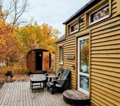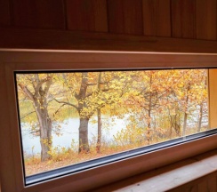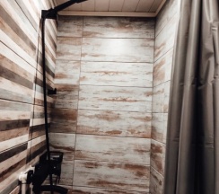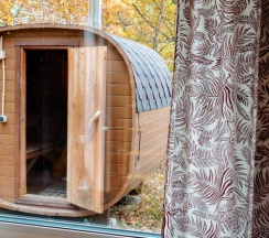 Сауна электрическая: с веником не попаришься, но красиво и функционально (нажал на кнопку и прогревает до средней степени прожарки). Это немного странно для домика в лесу, но вдруг вам нравится парадоксальность бытия? Если хочется дровяной бани - у нас их тут много в других домах, на все вкусы, а электрическая сауна одна.