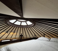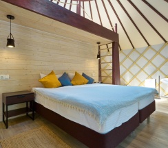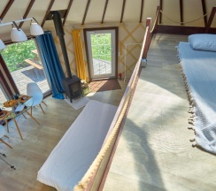 Размещение в комфортабельной круглогодичной юрте. Панорамное окно и невероятный вид на лес. Продуманный до мелочей дизайн. Терраса с шезлонгами и столиком. Кровати с ортопедическими матрасами (возможно размещение с двумя раздельными кроватями или одной двуспальной), спальное место на мезонине на двоих (размер 180*200), который покоряет сердца наших маленьких гостей