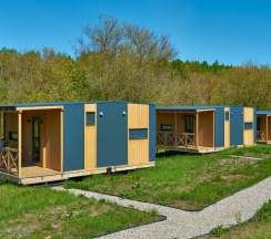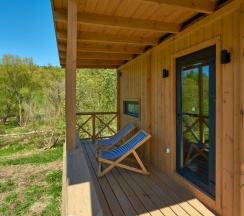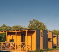 А также модульными домами с панорамными окнами с видом на лес вдоль речки.
