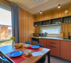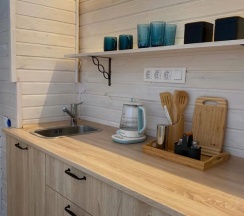 В домиках отдельная спальня и зал совмещенный с кухней.
