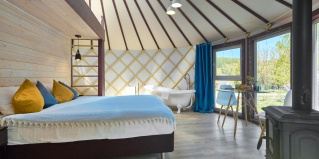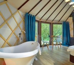 Двухместная LUXURY ЮРТА с ванной на ножках напротив панорамного окна.