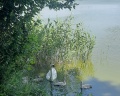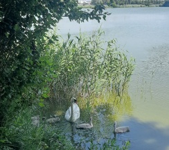 Рядом есть пруд, где живёт целое лебединое семейство.