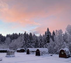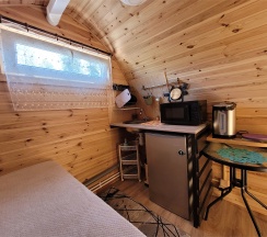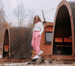 Достаточно уютный, все есть, было тепло (есть обогреватель), предусмотрены плотные шторки, есть холодильник, термопот, в домике было чисто, нам разрешили собаку за доплату, ей даже организовали полотенце, миску и пакетики.