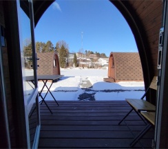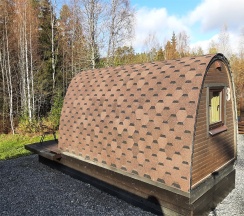 Небольшой арочный домик для отдыха с видом на лесной массив и отдельной террасой готов принять максимум двух гостей. В домике находится удобный двуспальный раскладной диван (1400*2000).