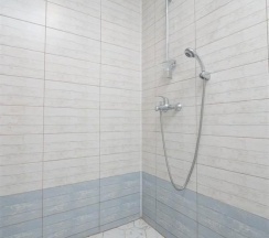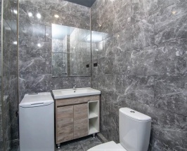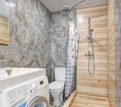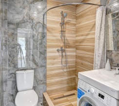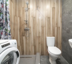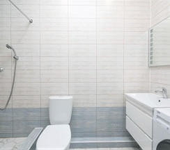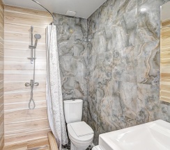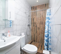 Ванная комната: Душевая кабина, раковина, туалет, туалетные принадлежности.